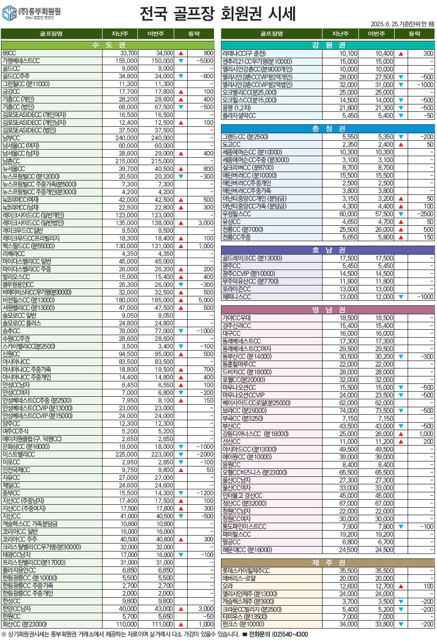 2025년 6월 4주차 회원권 시세동향